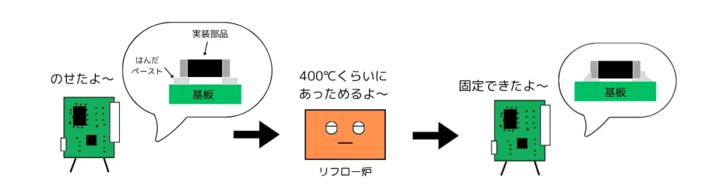 これを「リフロー方式」といい、はんだで固定できるような端子を付けた部品のことを「実装部品(SMD)」とよびます。